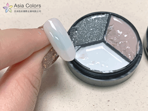 接著使用我們亞洲色彩的晶石貓眼,可以看一下塗上去的效果會有一點微透灰閃亮片的效果~